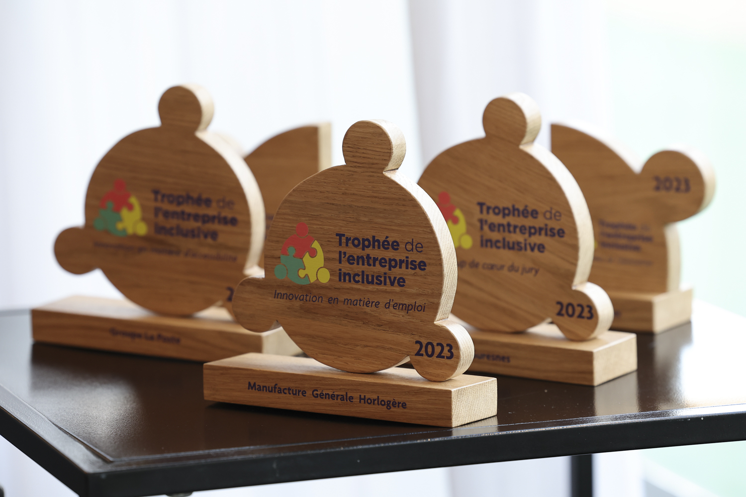 Le Trophée de l’Entreprise Inclusive a été remis à 3 lauréats en 2023 : la Manufacture Générale Horlogère, le groupe La Poste, et la Ville de Suresnes ; ainsi qu’un coup de projecteur de l’association sur le partenariat Nespresso pour Café Joyeux. Découvrez ci-dessous leurs initiatives !